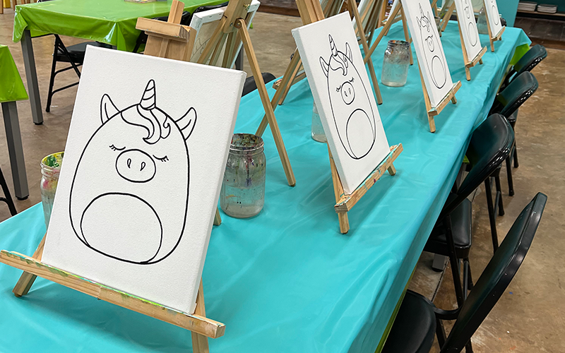 Our Canvas Package is $200 for up to 8 kids, and $18 per additional child. Cost includes pre-drawn 11x14" canvases, paint, and supplies. Your paintings will be available to take home the same day. A minimum of 1 week advance notice is required for canvas parties. Canvas parties are only available for children turning 7 & up. An image catalog is available via email or in-store for canvas design selection. Cake, light snacks, and tabletop decorations are allowed. A staff member will be on hand to help facilitate.